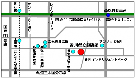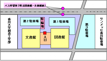 「県立図書館・文書館前」下車、徒歩3分(65「レインボー通り・サンメッセ香川・川島・山田総合センター」便)