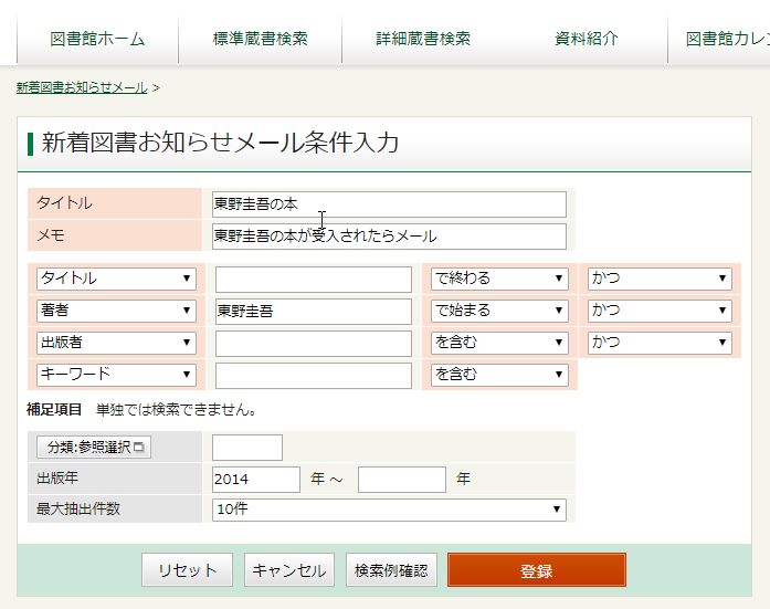 「新着図書お知らせメール条件入力画面」に移動します。 |