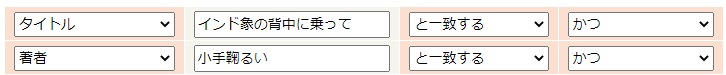 (例)タイトルが『インド象の背中に乗って』で、著者が「小手鞠るい」の本を探す。