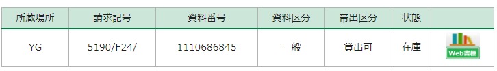 2.請求記号(本の背表紙についているラベル)、場所(本のある場所)、帯出区分(借りることができる本かどうか)、状態(貸出中かどうか)などの詳しい情報が表示されます。
