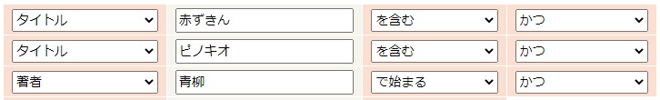 (例)タイトルに「赤ずきん」と「ピノキオ」という言葉が含まれ、著者が「青柳」で始まる本を探す。