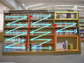サイズが大きい本は、請求記号どおりの位置ではなく、 その分類記号の本が並べてある棚の一番下などに置いています。(例:写真のオレンジ色の枠の中)